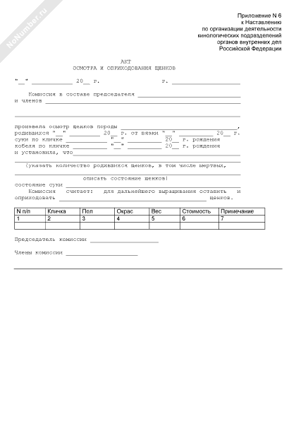 Акт осмотра и оприходования щенков