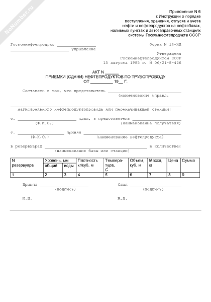 Акт приемки (сдачи) нефтепродуктов по трубопроводу (форма № 14-НП)