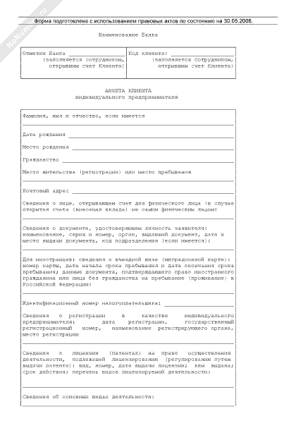 - 85Анкета клиента банка — индивидуального предпринимателя