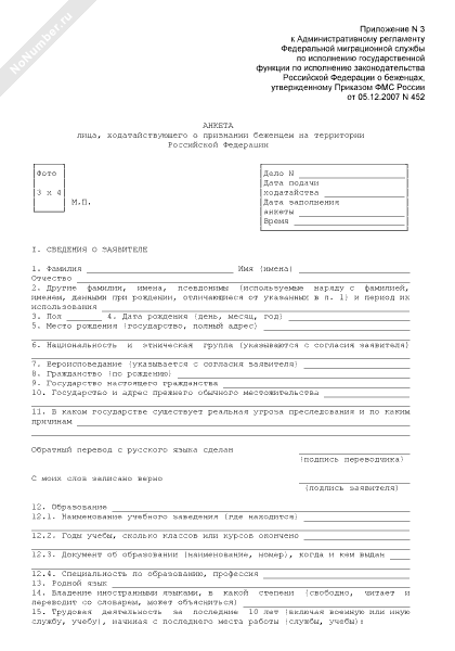 - 93Анкета лица, ходатайствующего о признании беженцем на территории Российской Федерации