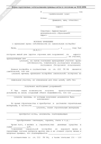 - 193Исковое заявление о признании права собственности на самовольную постройку