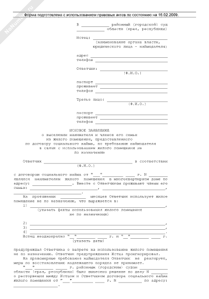 - 199Исковое заявление о выселении нанимателя и членов его семьи из жилого помещения, предоставленного по договорам социального найма, в связи с использованием жилого помещения не по назначению по требованию наймодателя
