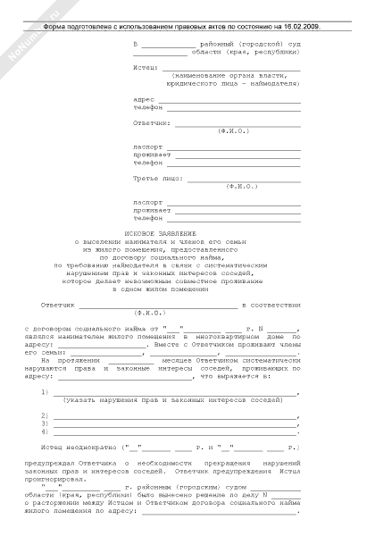 - 200Исковое заявление о выселении нанимателя и членов его семьи из жилого помещения, предоставленного по договорам социального найма, в связи с систематическим нарушением прав и законных интересов соседей, которое делает невозможным совместное проживание в одном жилом помещении, по требованию наймодателя