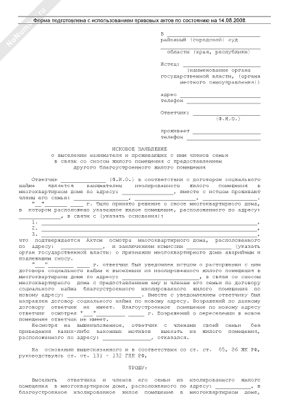 - 190Исковое заявление о выселении нанимателя и проживающих с ним членов семьи в связи со сносом жилого помещения с предоставлением другого благоустроенного жилого помещения