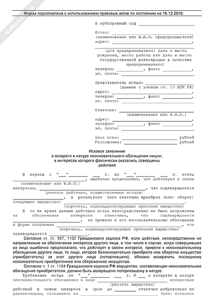 - 1603Исковое заявление в арбитражный суд лица, ошибочно полагавшего, что действует в своем интересе, о возврате стоимости имущества, составившего неосновательное обогащение лица, в интересах которого фактически оказались совершены действия