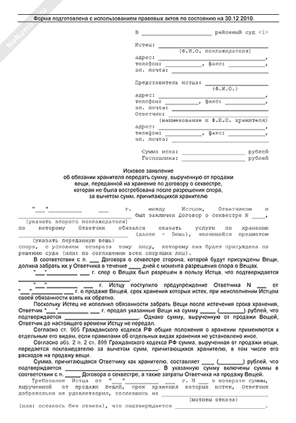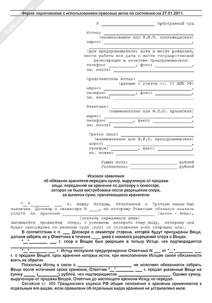 - 1660Исковое заявление поклажедателя в арбитражный суд об обязании хранителя передать сумму, вырученную от продажи вещи, переданной на хранение по договору о секвестре, которая не была востребована после разрешения спора, за вычетом сумм, причитающихся хранителю