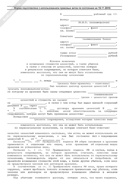 Исковое заявление клиента в суд общей юрисдикции о возмещении банком стоимости ценностей, а также убытков в связи с отказом от ценностей, качество которых в результате повреждения, за которое отвечает банк, изменилось настолько, что они не могут быть использованы по первоначальному назначению (рекомендуемый образец заполнения)