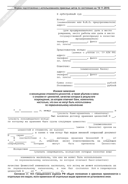 Исковое заявление клиента в арбитражный суд о возмещении банком стоимости ценностей, а также убытков в связи с отказом от ценностей, качество которых в результате повреждения, за которое отвечает банк, изменилось настолько, что они не могут быть использованы по первоначальному назначению (рекомендуемый образец заполнения)