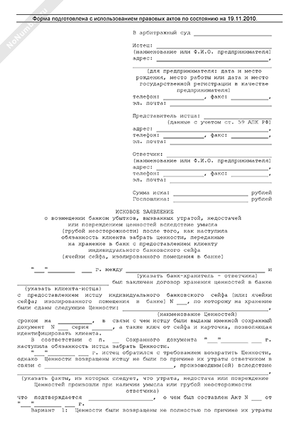 Исковое заявление клиента в арбитражный суд о возмещении банком убытков, вызванных утратой, недостачей или повреждением ценностей вследствие умысла (грубой неосторожности) после того, как наступила обязанность клиента забрать ценности, переданные на хранение в банк с предоставлением клиенту индивидуального банковского сейфа (ячейки сейфа, изолированного помещения в банке)