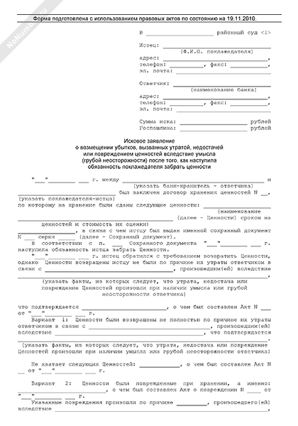 Исковое заявление клиента в суд общей юрисдикции о возмещении банком убытков, вызванных утратой, недостачей или повреждением ценностей вследствие умысла (грубой неосторожности) после того, как наступила обязанность клиента забрать ценности