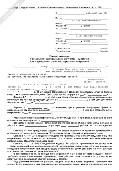 Исковое заявление клиента в суд общей юрисдикции о возмещении банком убытков, вызванных утратой, недостачей или повреждением ценностей, переданных на хранение (рекомендуемый образец заполнения)