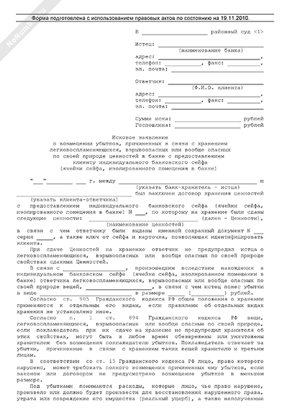 Исковое заявление банка в суд общей юрисдикции о возмещении клиентом убытков, причиненных в связи с хранением легковоспламеняющихся, взрывоопасных или вообще опасных по своей природе ценностей в банке с предоставлением клиенту индивидуального банковского сейфа (ячейки сейфа, изолированного помещения в банке)