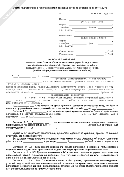 Исковое заявление клиента в суд общей юрисдикции о возмещении банком убытков, вызванных утратой, недостачей или повреждением вещей, переданных на хранение в банк с предоставлением клиенту индивидуального банковского сейфа (ячейки сейфа, изолированного помещения в банке)