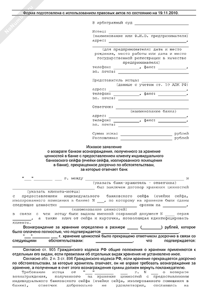 Исковое заявление клиента в арбитражный суд о возврате банком вознаграждения, полученного за хранение ценностей в банке с предоставлением клиенту индивидуального банковского сейфа (ячейки сейфа, изолированного помещения в банке), прекращенное досрочно по обстоятельствам, за которые отвечает банк