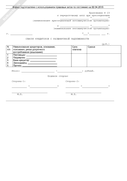 - 278Список кредиторов с расшифровкой задолженности (приложение к передаточному акту при присоединении некоммерческой организации к некоммерческой организации)
