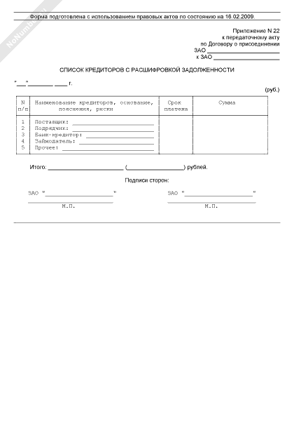 - 276Список кредиторов с расшифровкой задолженности (приложение к передаточному акту по договору о присоединении закрытого акционерного общества к закрытому акционерному обществу)