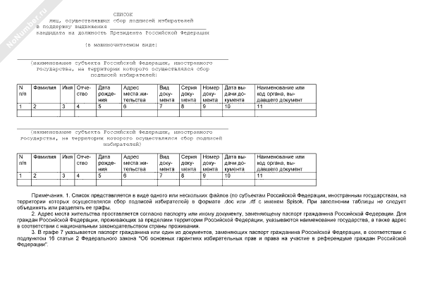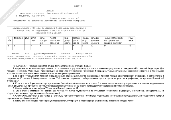 - 309Список лиц, осуществлявших сбор подписей избирателей в поддержку выдвижения кандидата на должность Президента Российской Федерации, с нотариально удостоверенными сведениями об указанных лицах и подписями указанных лиц (на бумажном носителе) (обязательная форма)