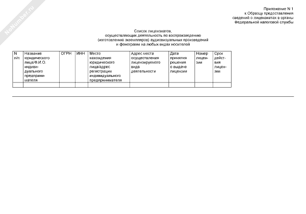- 319Список лицензиатов, осуществляющих деятельность по воспроизведению (изготовлению экземпляров) аудиовизуальных произведений и фонограмм на любых видах носителей (приложение к образцу предоставления сведений о лицензиатах в органы Федеральной налоговой службы)