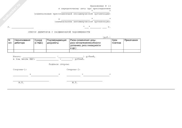 - 149Список дебиторов с расшифровкой задолженности (приложение к передаточному акту при присоединении некоммерческой организации к некоммерческой организации)