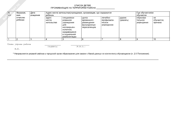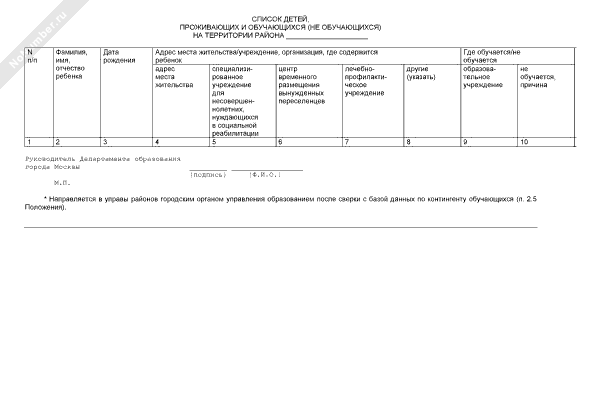 - 160Список детей, проживающих и обучающихся (не обучающихся) на территории района, с внесенными сведениями о контингенте обучающихся, направляемый городским органом управления образованием в соответствующие управы районов для уточнения данных первичного учета