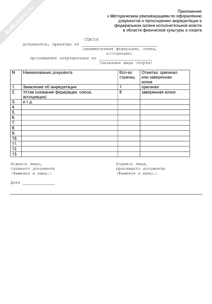 Список документов, принятых для прохождения аккредитации в области физической культуры и спорта (рекомендуемый образец заполнения)