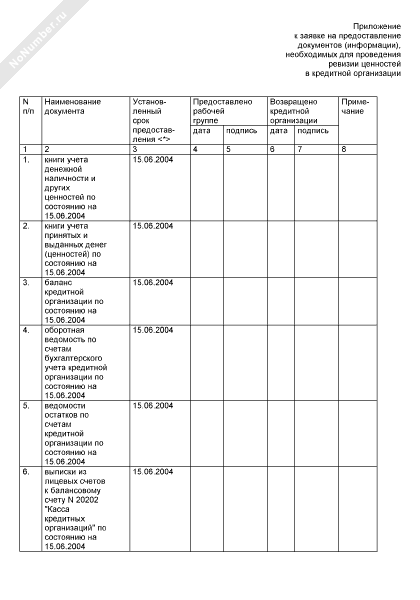 Список документов, предоставленных кредитной организацией для проведения ревизии ее ценностей (приложение к заявке на предоставление документов (информации), необходимых для проведения ревизии ценностей в кредитной организации)