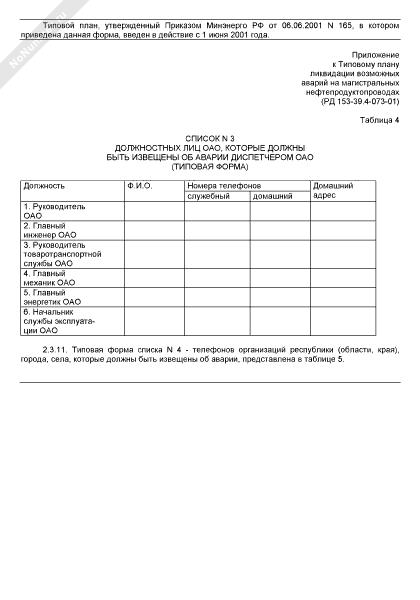 Список должностных лиц ОАО, которые должны быть извещены об аварии диспетчером ОАО (типовая форма) (таблица 4)