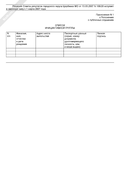 Список инициативной группы в муниципальном образовании «Город Щербинка» Московской области (рекомендуемый образец заполнения)