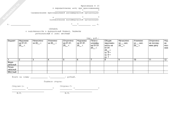Список задолженностей в федеральный бюджет, бюджеты региональный и (или) местный (приложение к передаточному акту при присоединении некоммерческой организации к некоммерческой организации)