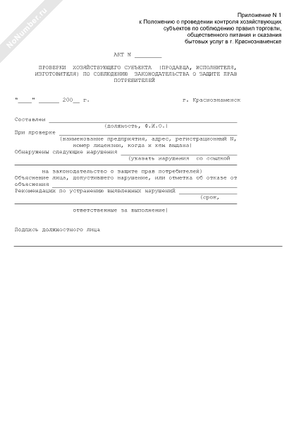 - 2140Акт проверки хозяйствующего субъекта (продавца, исполнителя, изготовителя) по соблюдению законодательства о защите прав потребителей на территории города Краснознаменска Московской области