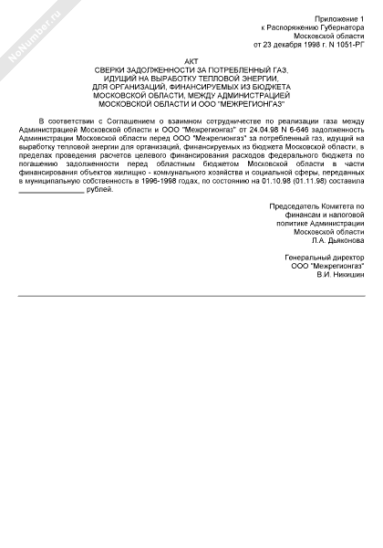 - 2222Акт сверки задолженности за потребленный газ, идущий на выработку тепловой энергии, для организаций, финансируемых из бюджета Московской области, между Администрацией Московской области и ООО «Межрегионгаз»