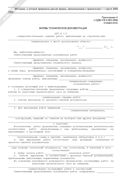 - 2638Формы технической документации дорожного хозяйства. Акт освидетельствования скрытых работ, выполненных на строительстве объекта (N 1/2)