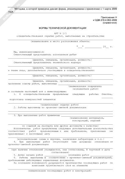 - 2637Формы технической документации дорожного хозяйства. Акт освидетельствования скрытых работ, выполненных на строительстве объекта (N 1/1)