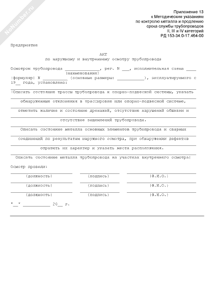 - 2621Рекомендуемые формы бланков для оформления материалов по контролю технического состояния. Акт по наружному и внутреннему осмотру трубопровода