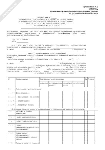 - 2625Сводный акт приемки-передачи документов и актов по сдаче-приемке документации, материальных ценностей и согласованных обязательств по многоквартирному дому, находящемуся в общей долевой собственности собственников в городском поселении Мытищи Московской области