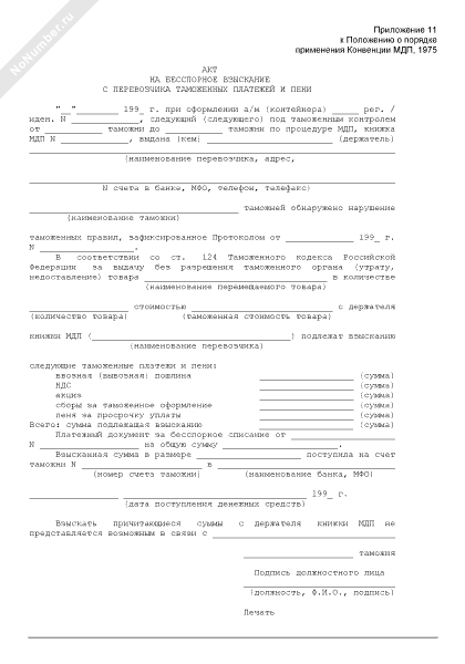 - 290Акт на бесспорное взыскание с перевозчика таможенных платежей и пени