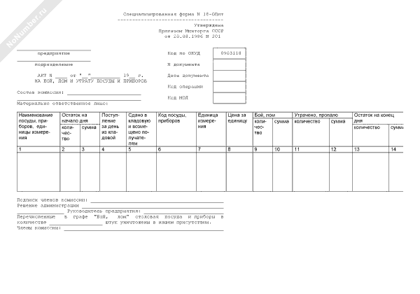 - 292Акт на бой, лом и утрату посуды и приборов (специализированная форма № 18-ОПит)