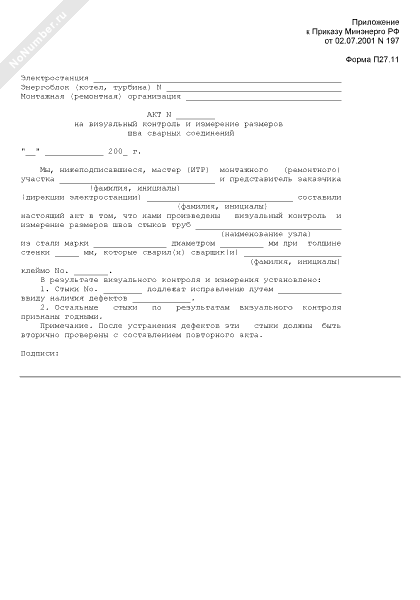 - 293Акт на визуальный контроль и измерение размеров шва сварных соединений (форма № П27.11)