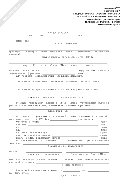 - 294Акт на возврат излишне уплаченных или взысканных таможенных платежей, начисленных по ГТД