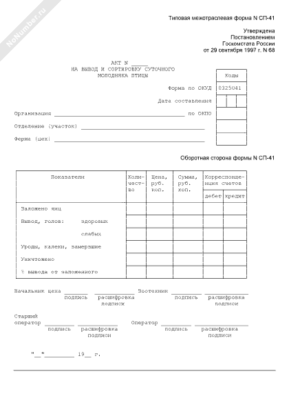 - 299Акт на вывод и сортировку суточного молодняка птицы (типовая межотраслевая форма № СП-41)