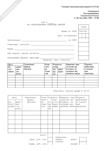 - 326Акт на оприходование приплода зверей (типовая межотраслевая форма № СП-42)