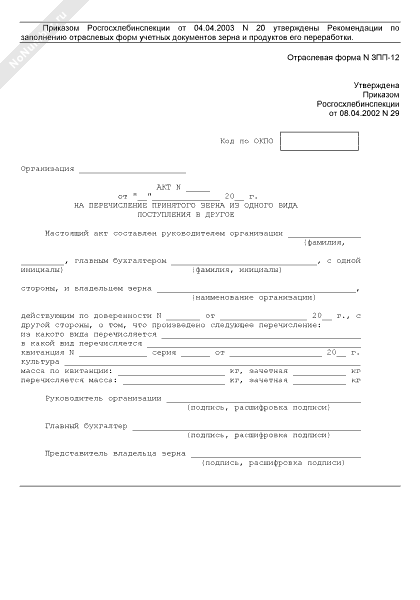 - 338Акт на перечисление принятого зерна из одного вида поступления в другое (отраслевая форма № ЗПП-12)