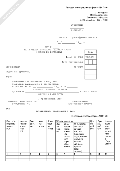 - 335Акт на передачу (продажу), закупку скота и птицы по договорам (типовая межотраслевая форма № СП-46)