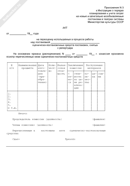 - 337Акт на переоценку используемых в процессе работы над постановкой сценическо-постановочных средств постановок, снятых с репертуара