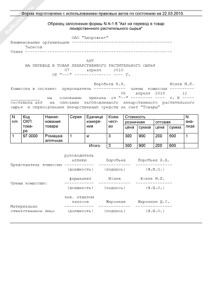- 334Акт на перевод в товар лекарственного растительного сырья (образец заполнения формы № А-1.6)