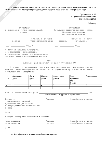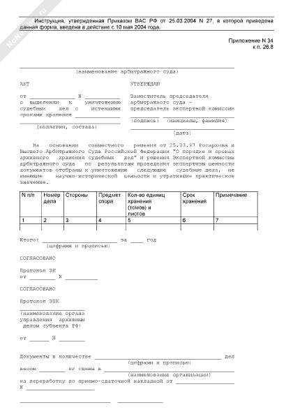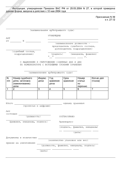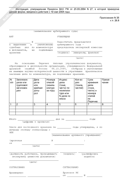 - 448Акт о выделении к уничтожению судебных дел и дел по номенклатуре с истекшими сроками хранения в арбитражных судах Российской Федерации (первой, апелляционной и кассационной инстанциях)