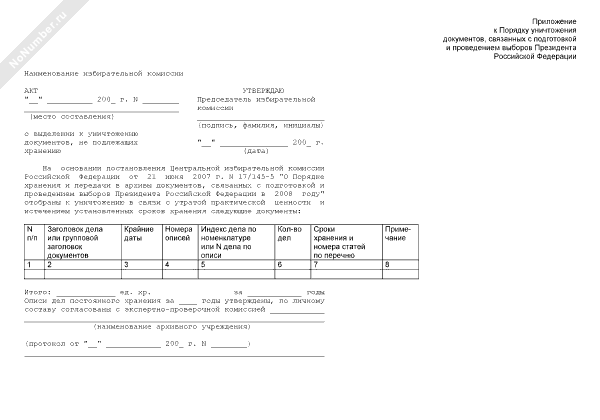 - 444Акт о выделении к уничтожению документов, не подлежащих хранению, связанных с подготовкой и проведением выборов Президента Российской Федерации