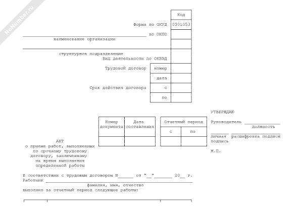- 663Акт о приеме работ, выполненных по срочному трудовому договору, заключенному на время выполнения определенной работы (унифицированная форма № Т-73)