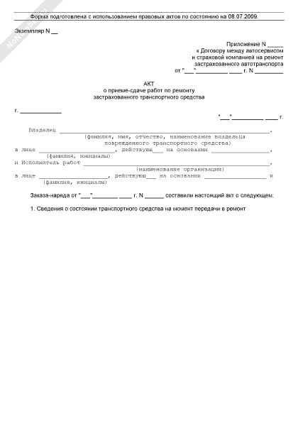 - 677Акт о приеме-сдаче работ по ремонту застрахованного транспортного средства (приложение к договору между автосервисом и страховой компанией на ремонт застрахованного автотранспорта)