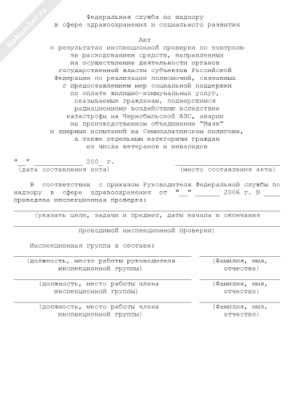- 776Акт о результатах инспекционной проверки по контролю за расходованием средств, направленных на осуществление деятельности органов государственной власти субъектов РФ по реализации полномочий, связанных с предоставлением мер социальной поддержки по оплате жилищно-коммунальных услуг, оказываемых гражданам, подвергшимся радиационному воздействию вследствие катастрофы на Чернобыльской АЭС, аварии на производственном объединении «Маяк» и ядерных испытаний на Семипалатинском полигоне, а также отдельным категориям граждан из числа ветеранов и инвалидов